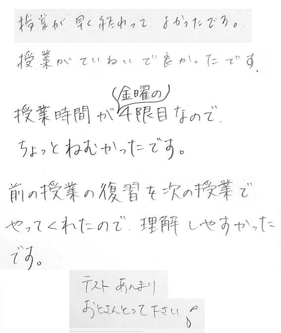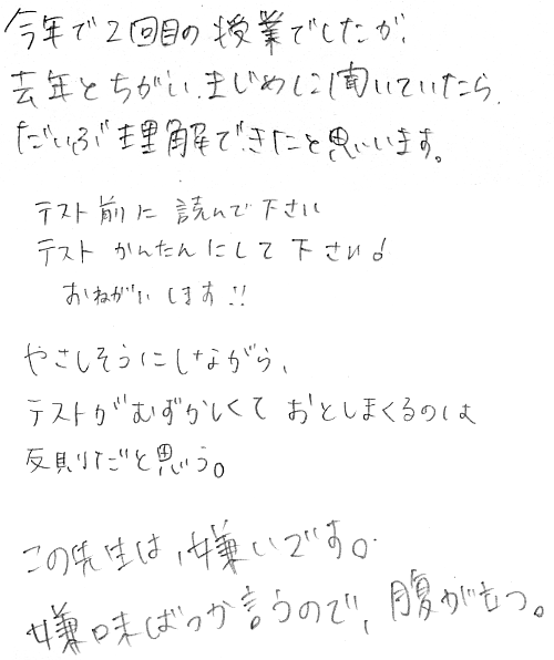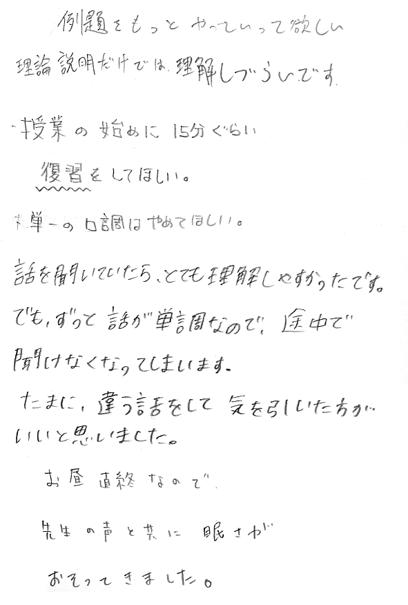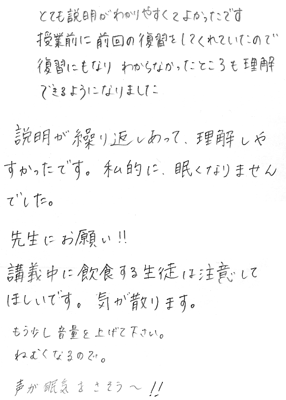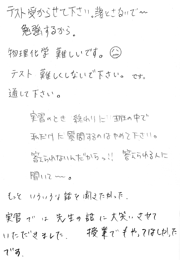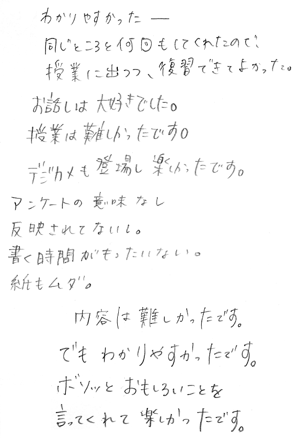 - 出ていく学生がうるさい:気はついていました.が,出て行ってしまった学生に注意はなかなかできません.飲食や携帯電話のこともあるので,最初にマナーについて話すようにします.