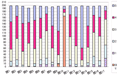 上のグラフが分かりづらいというクレームがありました.作成したのは私ではありませんが,ほんとにその通りだと思います.たぶん,一般的には全体に占める割合を把握しやすい円グラフで表し,平均値との比較などはグラフに入れないと思いますので,下に作りかえました.アンケート質問の項目をクリックすると円グラフが現れます.