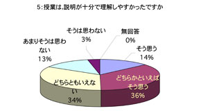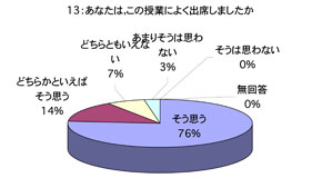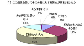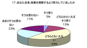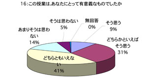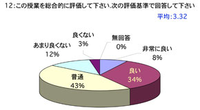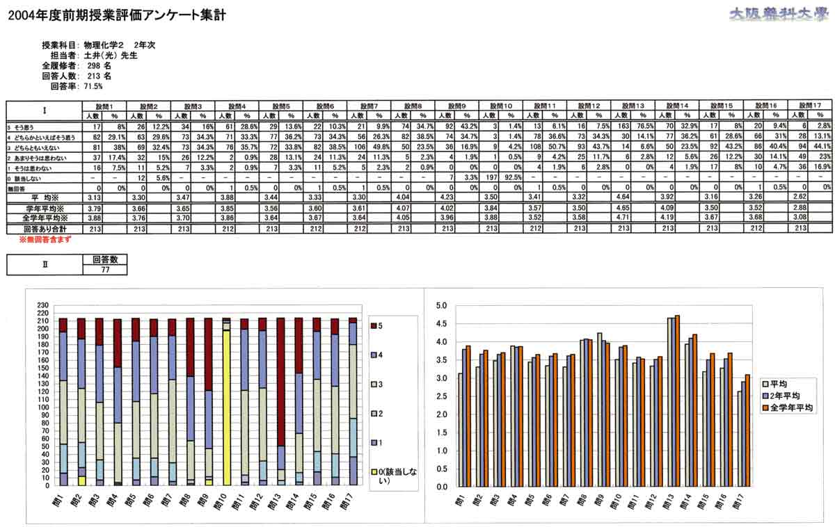 授業について 1. 口調が明瞭で聞き取りやすかったですか 2. 板書やその他(プリント,OHP,ビデオ,液晶プロジェクター)による説明が適切で授業の理解に役立ちましたか (板書等を使用しなかった場合は0を記入してください) 3. ポイントをよく押さえ,うまく要約されてましたかx 4. 授業は,「授業の内容」(シラバス)に沿って進められましたか 5. 授業は,説明が十分で理解しやすかったですか 6. 授業に対する関心を高める努力がなされていましたか 7. 私語や態度の悪い学生に対し注意するなど,静かに授業が行われるよう工夫されていましたか 8. 授業は,時間通り始まり時間通り終わりましたか 9. テキストやその他の教材を使用していた場合,それは適切に行われていましたが (指定されていない場合は0を記入してください) 10. 休講があった場合,その補いは十分になされていましたか (休講がなかった場合は0を記入してください) 11. 授業内容のレベルはあなたにとって適切でしたか.次の基準で回答してください (5-非常に難しい,4-難しい,3-適切,2-簡単,1-簡単すぎる) 12. この授業を総合的に評価してください.次の基準で回答してください (5-非常によい,4-良い,3-普通,2-あまり良くない,1-良くない) あなたについて 13. あなたは,この授業によく出席しましたか 14. あなたは,私語などはせず授業に集中しましたか 15. この授業を受けてその分野に対する関心が高まりましたか 16. この授業は,あなたにとって有意義なものでしたか 17. あなた自身,授業を理解するよう努力(予習・復習等)していましたか