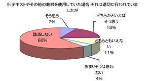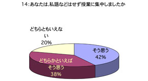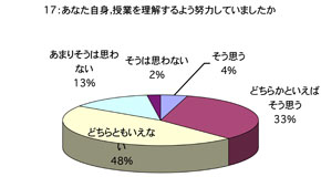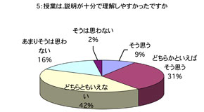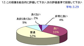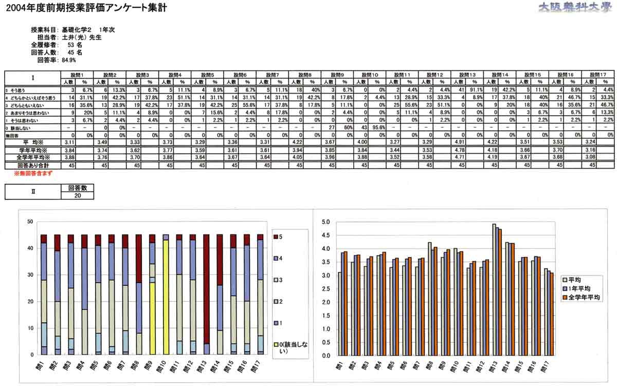 授業について 1. 口調が明瞭で聞き取りやすかったですか 2. 板書やその他(プリント,OHP,ビデオ,液晶プロジェクター)による説明が適切で授業の理解に役立ちましたか (板書等を使用しなかった場合は0を記入してください) 3. ポイントをよく押さえ,うまく要約されてましたかx 4. 授業は,「授業の内容」(シラバス)に沿って進められましたか 5. 授業は,説明が十分で理解しやすかったですか 6. 授業に対する関心を高める努力がなされていましたか 7. 私語や態度の悪い学生に対し注意するなど,静かに授業が行われるよう工夫されていましたか 8. 授業は,時間通り始まり時間通り終わりましたか 9. テキストやその他の教材を使用していた場合,それは適切に行われていましたが (指定されていない場合は0を記入してください) 10. 休講があった場合,その補いは十分になされていましたか (休講がなかった場合は0を記入してください) 11. 授業内容のレベルはあなたにとって適切でしたか.次の基準で回答してください (5-非常に難しい,4-難しい,3-適切,2-簡単,1-簡単すぎる) 12. この授業を総合的に評価してください.次の基準で回答してください (5-非常によい,4-良い,3-普通,2-あまり良くない,1-良くない) あなたについて 13. あなたは,この授業によく出席しましたか 14. あなたは,私語などはせず授業に集中しましたか 15. この授業を受けてその分野に対する関心が高まりましたか 16. この授業は,あなたにとって有意義なものでしたか 17. あなた自身,授業を理解するよう努力(予習・復習等)していましたか