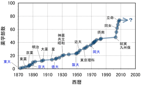※まちがいがあるかもしれなので,日本私立薬科大学協会,河合塾入試情報サイト,薬学部設立データを参照して下さい.