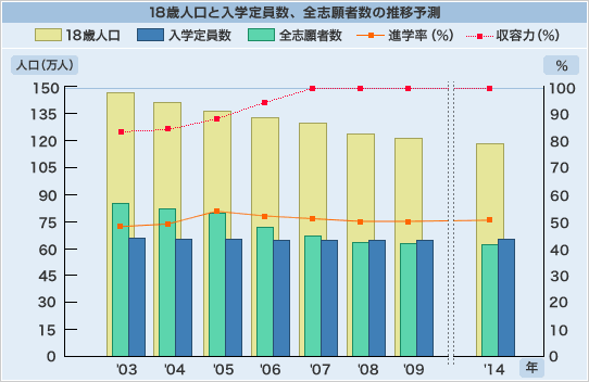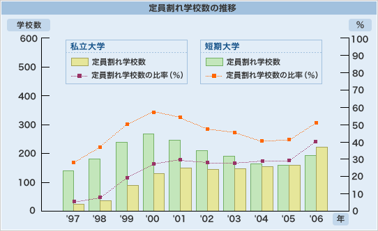 01-Aug-2007 | 日経進学ナビから | 18歳人口と定員 | 定員割れ学校数 | |