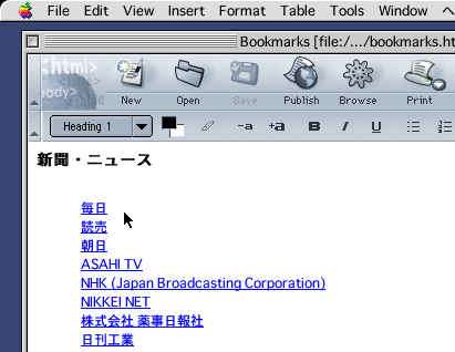 読み込んだところ.Bookmark.htmlは化けているのに,読み込むとちゃんとした文字になっています.