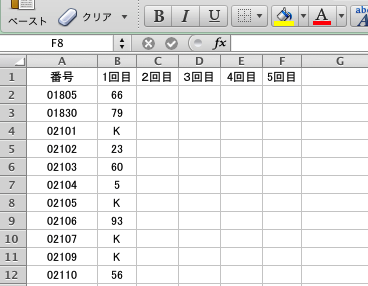 出力ファイル mmark-dat.MATCH.csv をエクセルで開き、点数のカラムをコピー(下図左)し、名簿の回数別カラムにペースト(下図右)する。