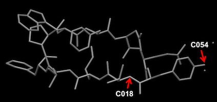 SHELXS/Dを実行すると、test1.res のような座標データが得られ、ピークの高さ順に原子がナンバリングされます。 WInGX や Mercury などのグラフィックツールで3D表示できます。 1 2 3 4 5 6 7 8 9 10 c[Val-Orn(OBzl)-Leu-DPhe-Pro-Trp-DPhe-Asn-Gln-Phe] C001 ---> D-Phe7 C = C072 <-- 07残基目のC C002 ---> Gln9 N = N091 <-- 09残基目のN C003 ---> Phe10 Cα = C101 <-- 10残基目のCα C004 ---> Asn8 N = N081 <-- 07残基目のN ...というふうに、エディターソフトの画面上で残基間を行ったり来たりする面倒な作業になります。また、renameの結果、原子の並びがバラバラになります。せめて結合順に並んでいればrenameも、並び替えも楽になります。