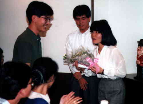 右の2人が林君と旧姓上村さん 上村さん(当時助手)の退職・結婚パーティにて