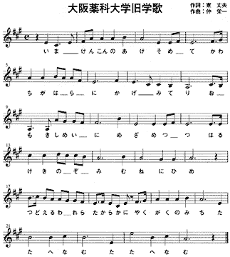 東 丈夫 作詞 仲 栄一 作曲 1.今乾坤(けんこん)の暁(あ)け初(そ)めて 河内が原に光満(かげみ)てり 重き使命に目覚めつつ 遙(はる)けき希(のぞ)み胸に秘め 集へる吾等高らかに 薬学の道讃(たた)へなむ 讃(たた)へなむ 2.緑に映(は)ゆる金剛の 山脈(やまなみ)とほく仰ぎつつ 真理(しんり)の社(もり)に分け入りて 思ひを凝(こ)らし知を磨く 若き生命(いのち)のひとすじに 薬学の道究(きわ)めなむ 究(きわ)めなむ 3.芽淳(ちぬ)の海原夕凪(な)ぎて 北辰永遠(ほくしんとは)に新たなり 地上の星と咲き誇る 契(ちぎ)りも固き若人の 燃ゆる意気もてともどもに 薬学の道貫(つら)ぬかむ 貫(つら)ぬかむ 指揮:当間修一 ピアノ:木下太陽 合唱:大阪ハインリッヒ・シュッツ室内合唱団 録音:2004.7.4 制作協力:大阪コレギウム・ムジクム |